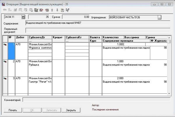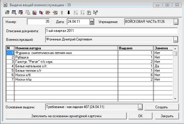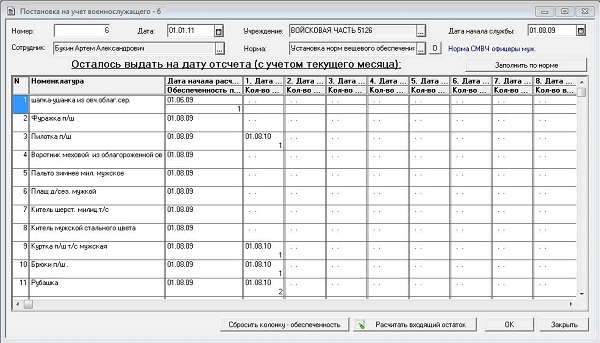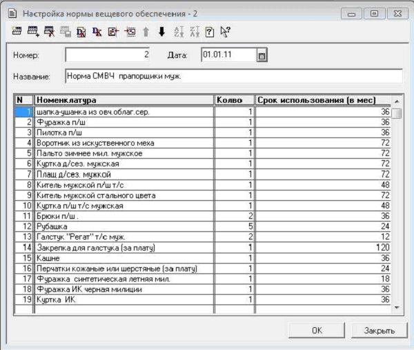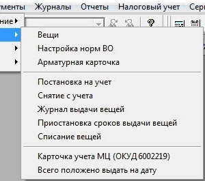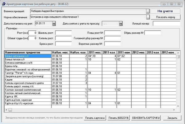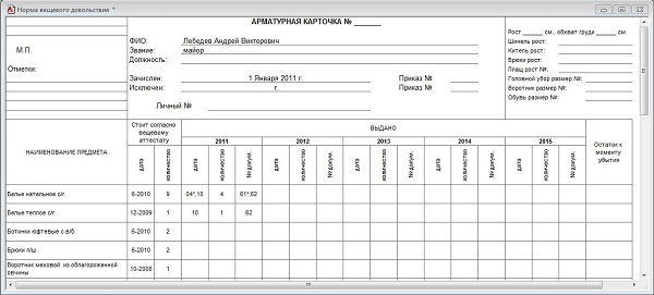 К СПИСКУ РАЗДЕЛОВДанный модуль предназначен для контроля вещевого обеспечения сотрудников. Т.е. поступления вещей на склад, учета норм вещего обеспечения, автоматического расчета арматурных карточек по каждому сотруднику, контроля выдачи вещей и автоматического списания в бухгалтерском учете.