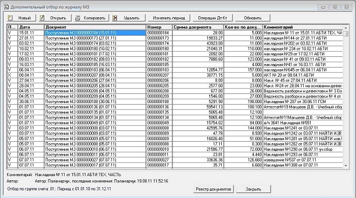К СПИСКУ РАЗДЕЛОВДанная обработка предназначена для - анализа всех документов в системе. В отличие от типового журнала МЗ или ОС, позволяет задавать дополнительные фильтры при выборе списка документа, а так же выводить дополнительные информационные поля по каждому документу.