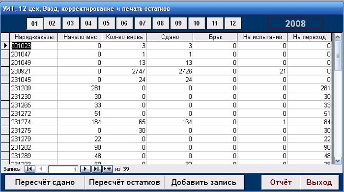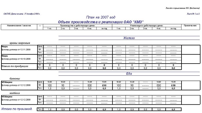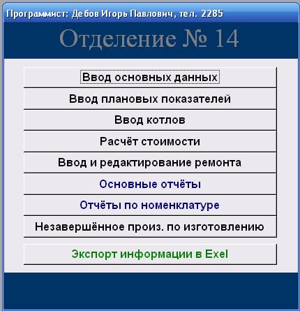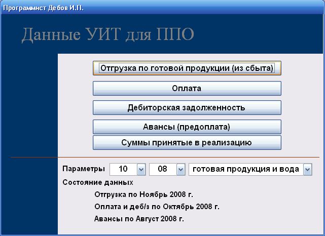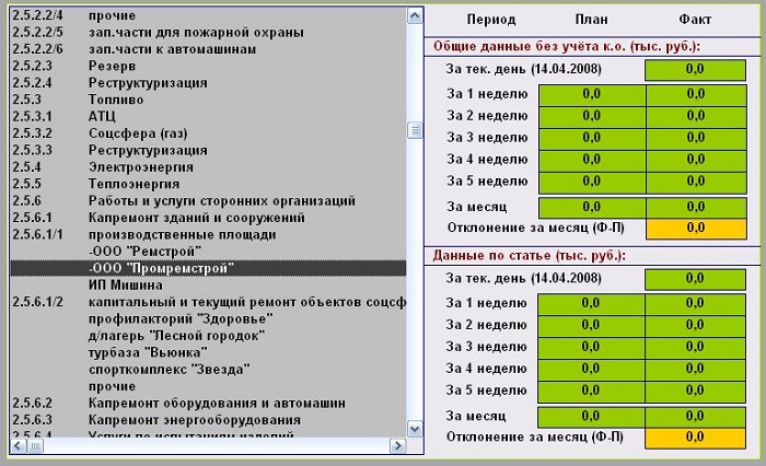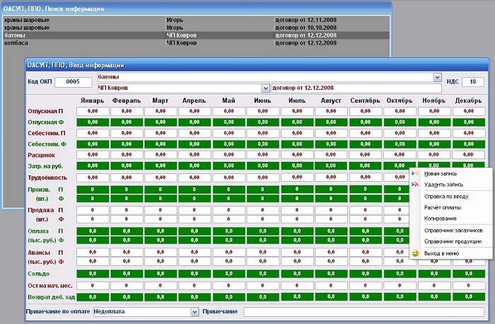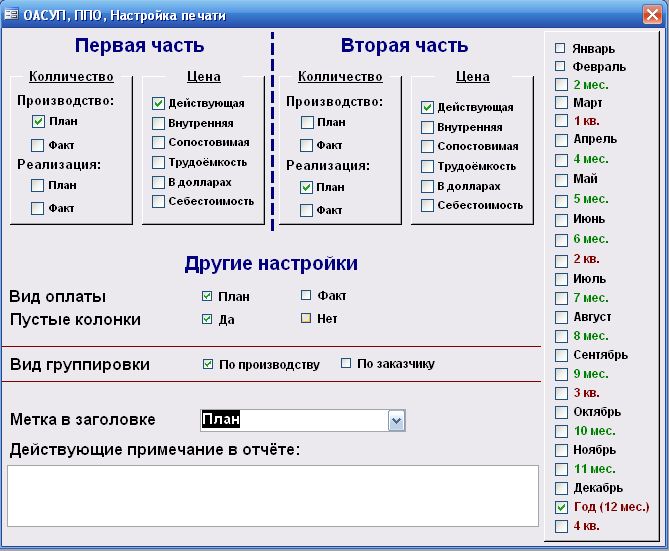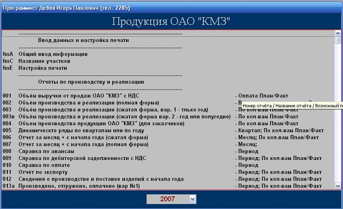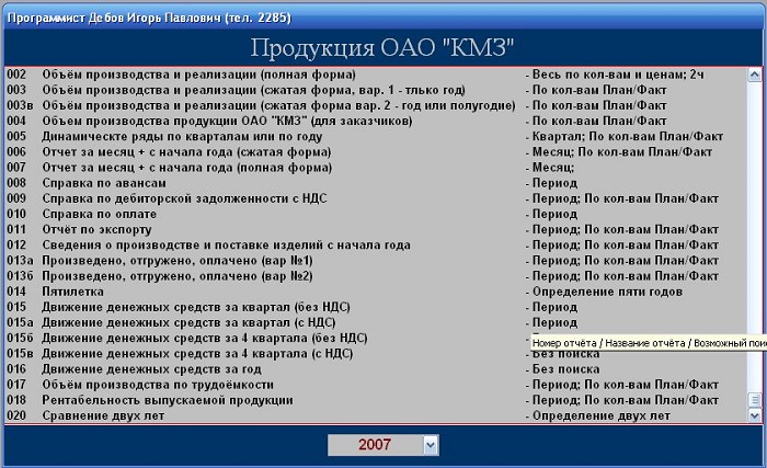 К СПИСКУ РАЗДЕЛОВКрупная система по анализу выпускаемой продукции. Используется восновном плановиками и экономистами. В этой программе присутствует достаточно подробный ввод информации по месяцам, а кварталы и другие периоды, вплоть до пяти лет, можно рассчитать, основываясь только на месяцы. Также в этой программе мной было разработано много различных отчётов в которых производится различный анализ, причём один и тот же отчёт можно пересчитать по плану или факту или сопоставить сразу оба варианта. При этом возможно задать различные цены как в рублях, так и нормо-часах. Также при построении отчёта возможно указать различные группировки и скрыть из расчёта ненужные позиции, чем обеспечиваются различные варианты одного и того же документа.