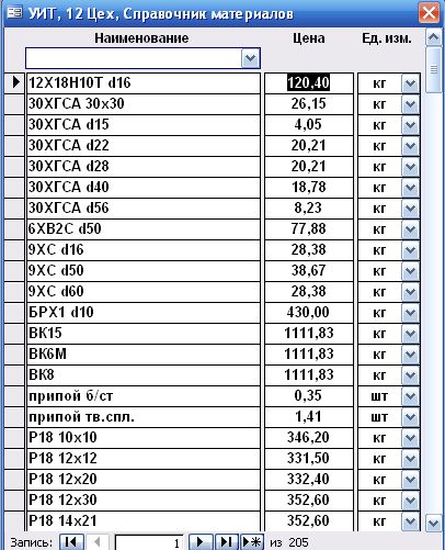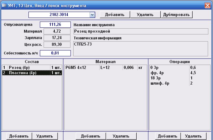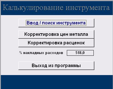 К СПИСКУ РАЗДЕЛОВЭта программа предназначена для расчёта стоимости инструмента исходя из стоимости материала и зарплаты. Вводятся все данные по инструменту, и автоматически на этой же форме считается цена и трудоёмкость. Также при изменении цеховых расходов или других норм, цена автоматически пересчитывается.