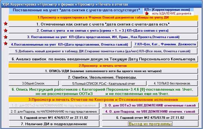 К СПИСКУ РАЗДЕЛОВВ этой программе ведётся учёт должностных инструкции (разработка, назначение, отслеживание изменений и снятие с исполнения), а также выводятся сводные отчёты по этой тематике. Программа разработана в MS Access и может работать как в сети, так и локально.