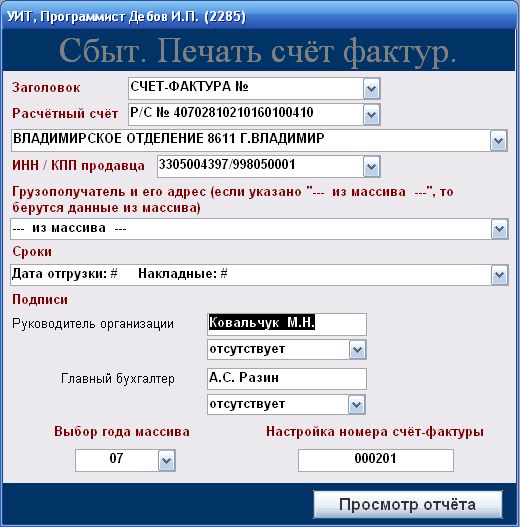 К СПИСКУ РАЗДЕЛОВПрограмма для выдачи на печать счёт фактур и счетов на предоплату. Эта программа разрабатывалась, когда в организации ещё не было крупных ERP систем, но на данный момент она уже устаревает. Информация для этой программы может загружаться из разных баз данных, а затем программа её рассчитывает и выдаёт на печать в обще принятом стандарте. Программа разработана в MS Access и может работать в различных версиях, кроме 97.