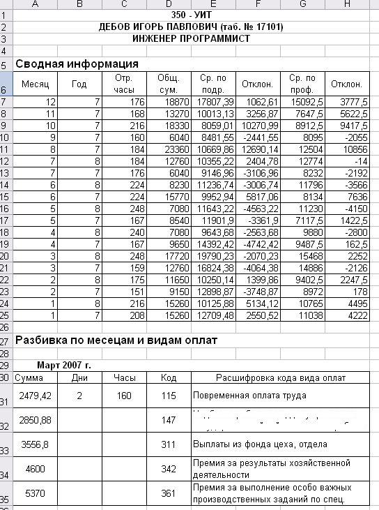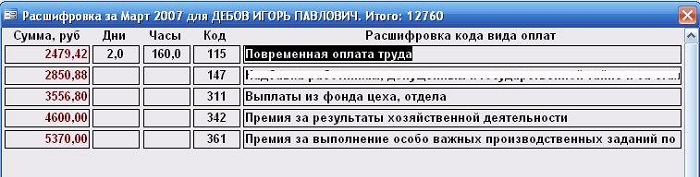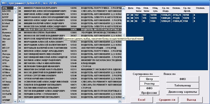 К СПИСКУ РАЗДЕЛОВЭта программа предназначена для просмотра и выгрузки в excel сводной информации по зарплате. Также в программе анализируются, с определённым приближением, различные виды отклонений зарплаты от средней по профессии, отделу и т.д. Вся информация представляется в разрезе отдел \ работник \ месяц + год, при этом возможно задавать различные поиски и сортировки данных. Исходная информация по кадрам, начислениям и удержаниям, а также видам оплат загружается в систему из внешних источников, а затем уже рассчитывается. Программа разработана в MS Access и может работать в различных версиях, кроме 97.